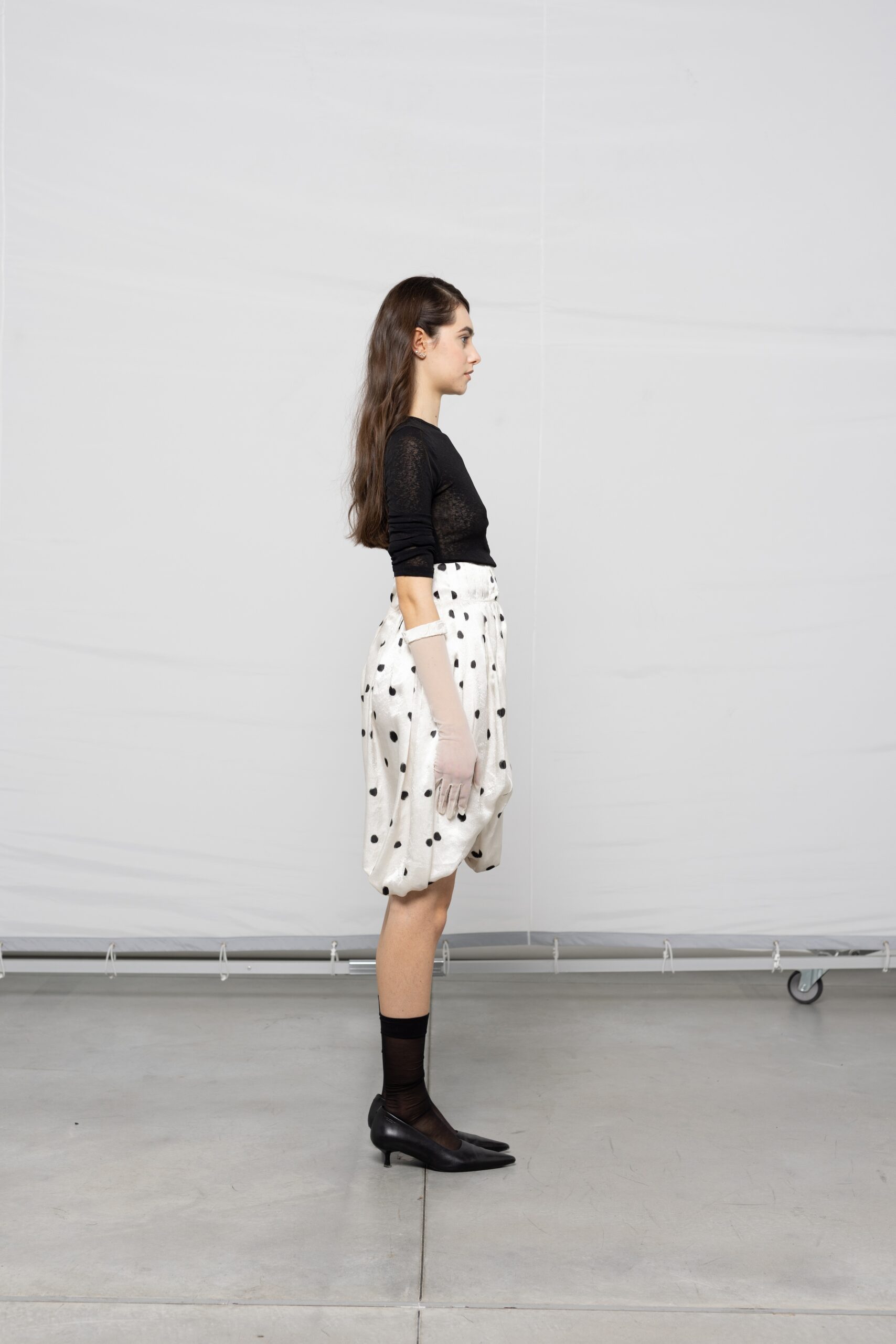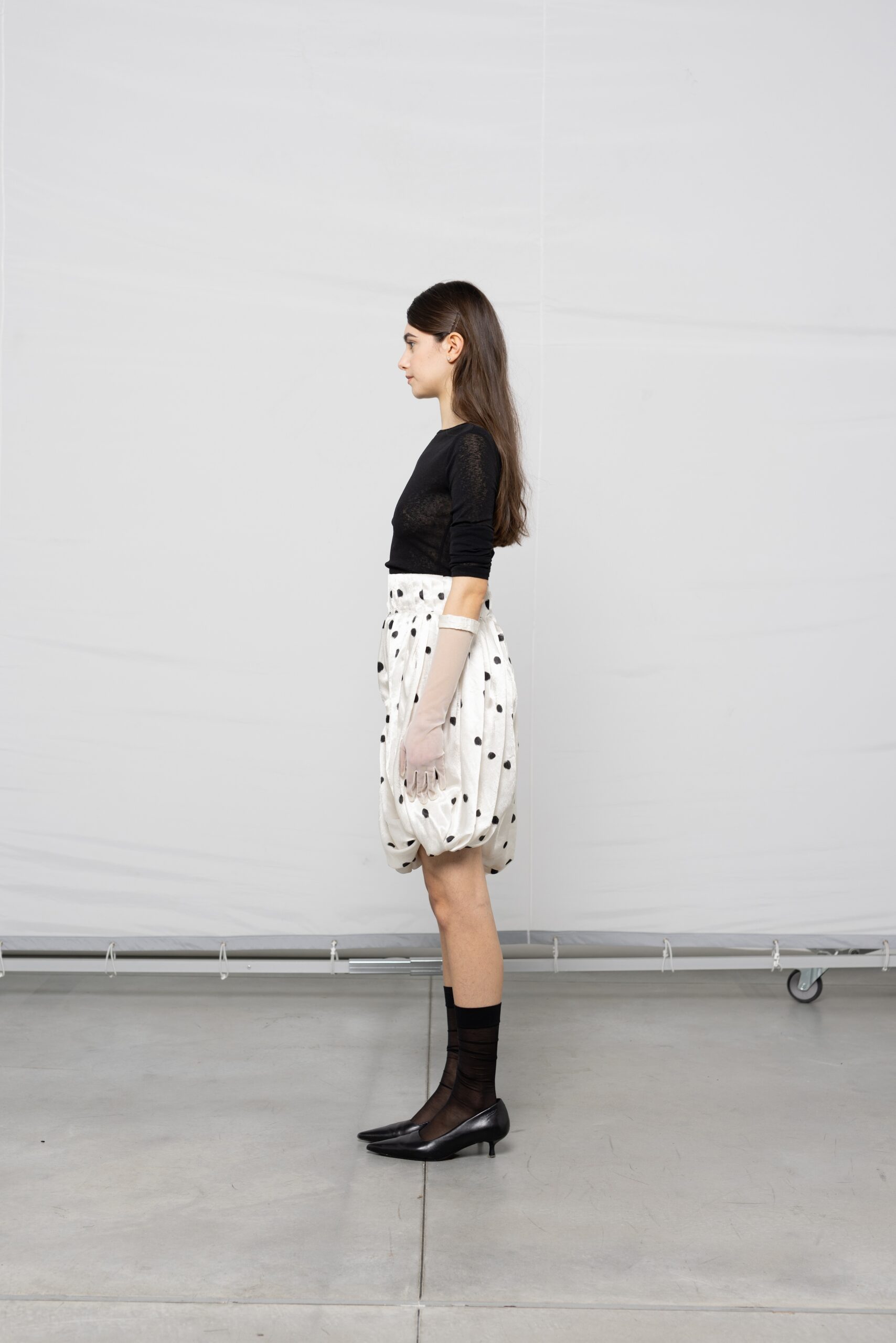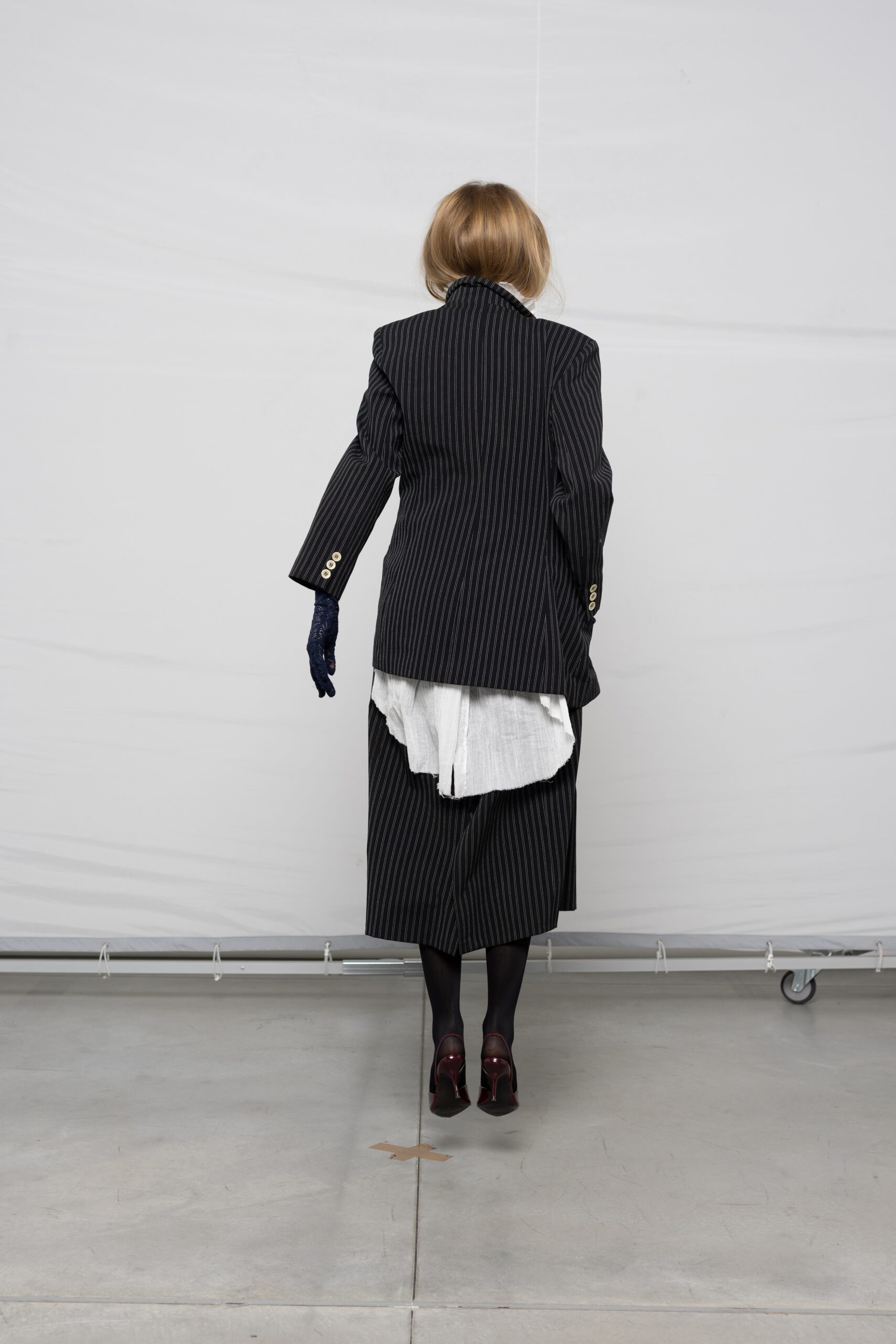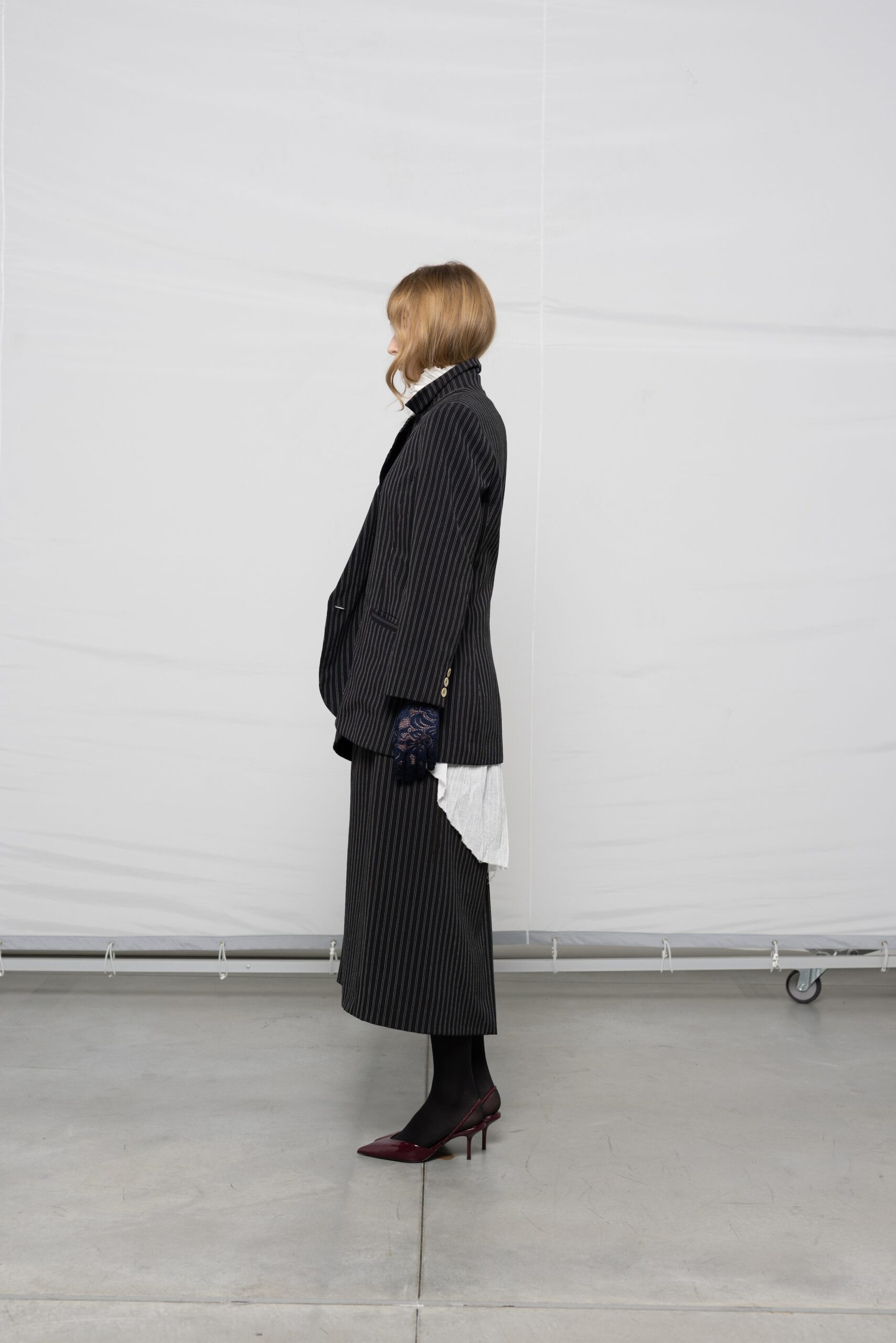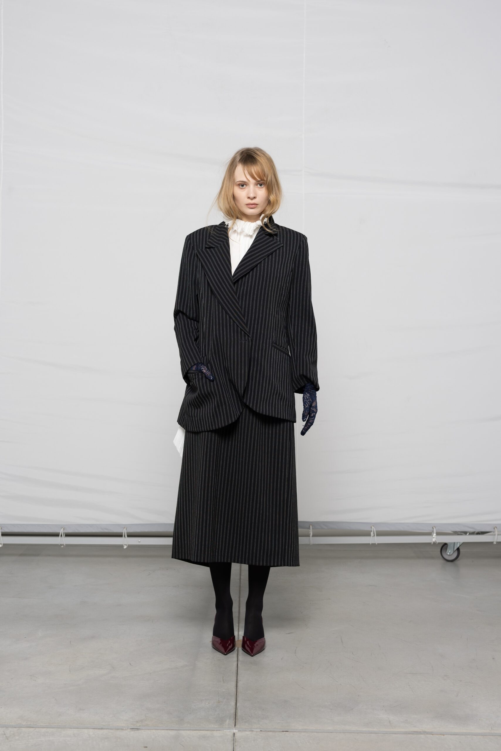 - Skirt suit, gloves, heels, tights: Stylist’s own