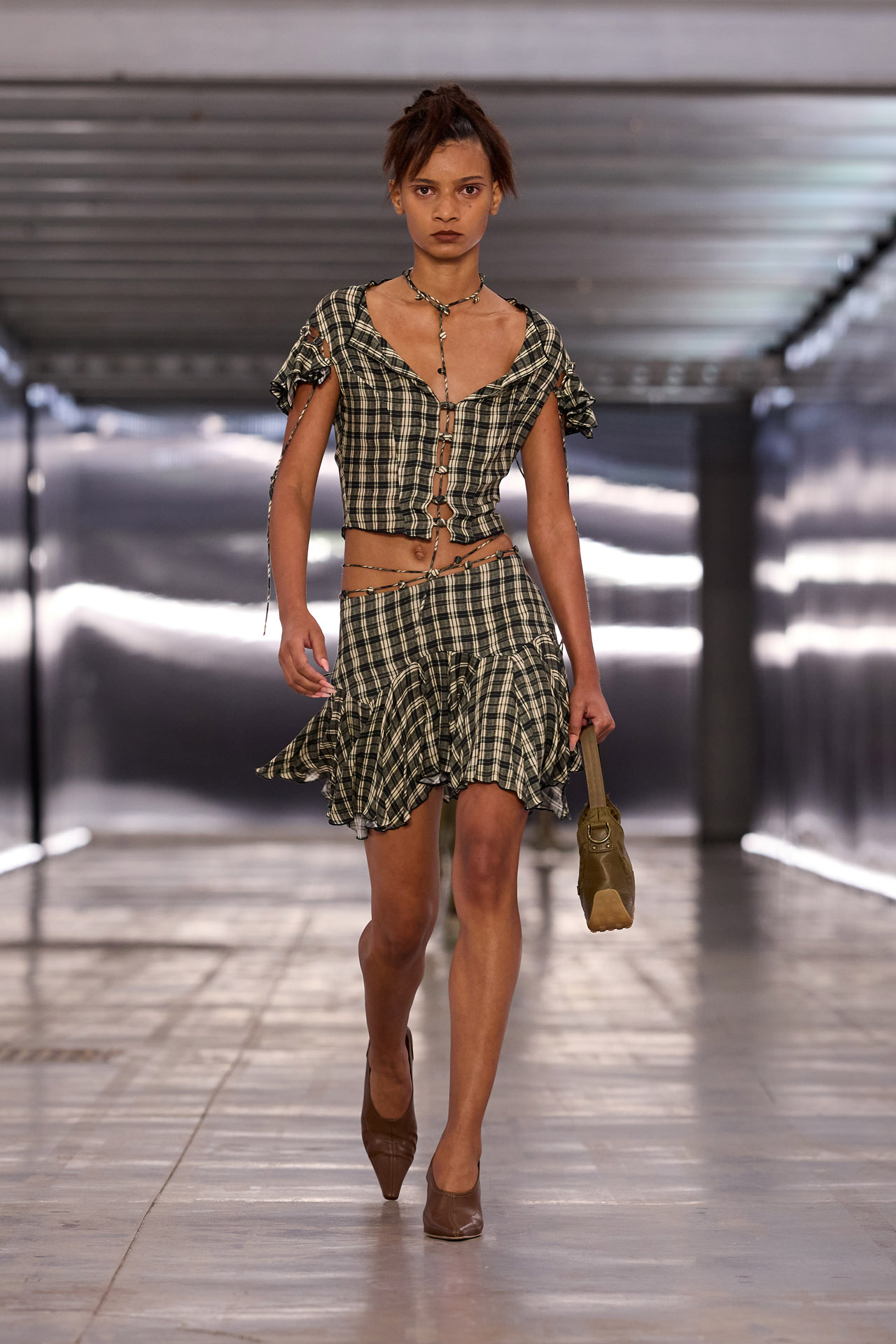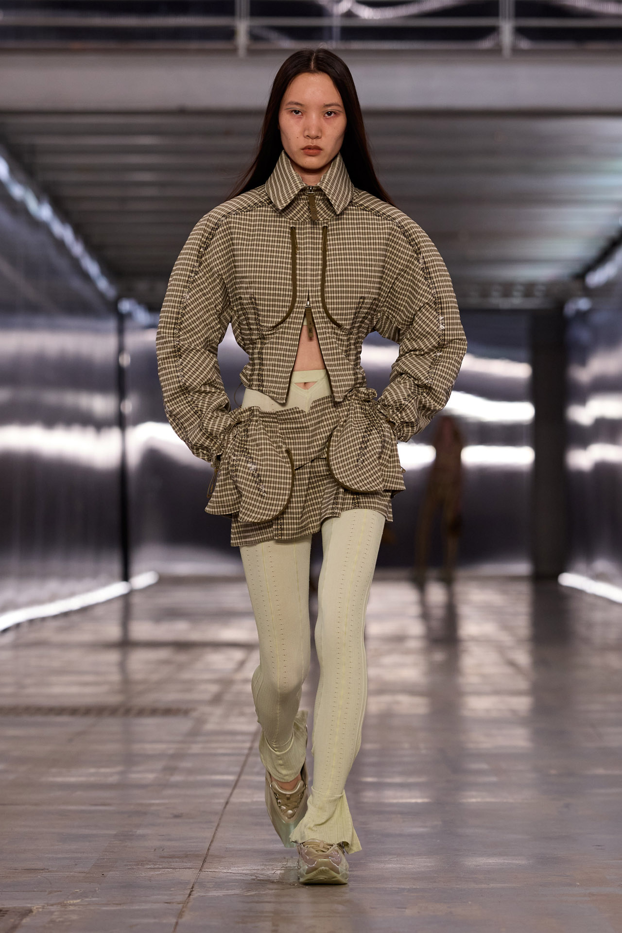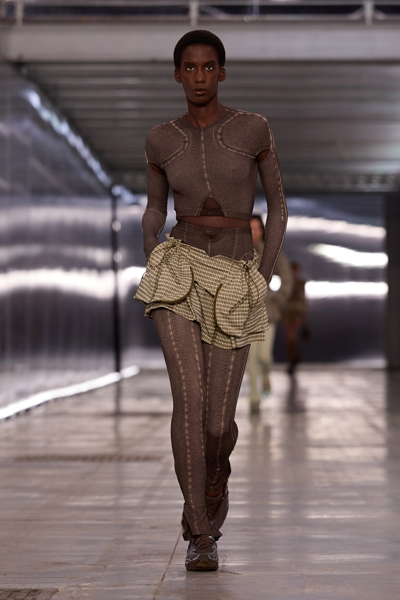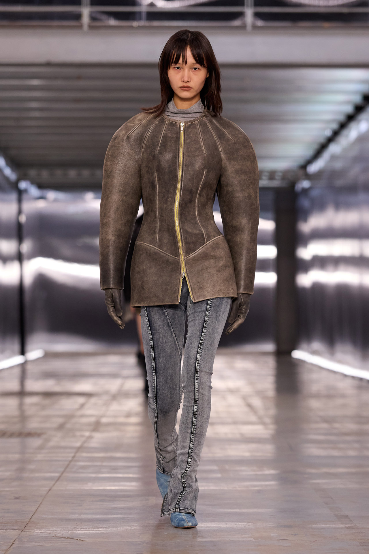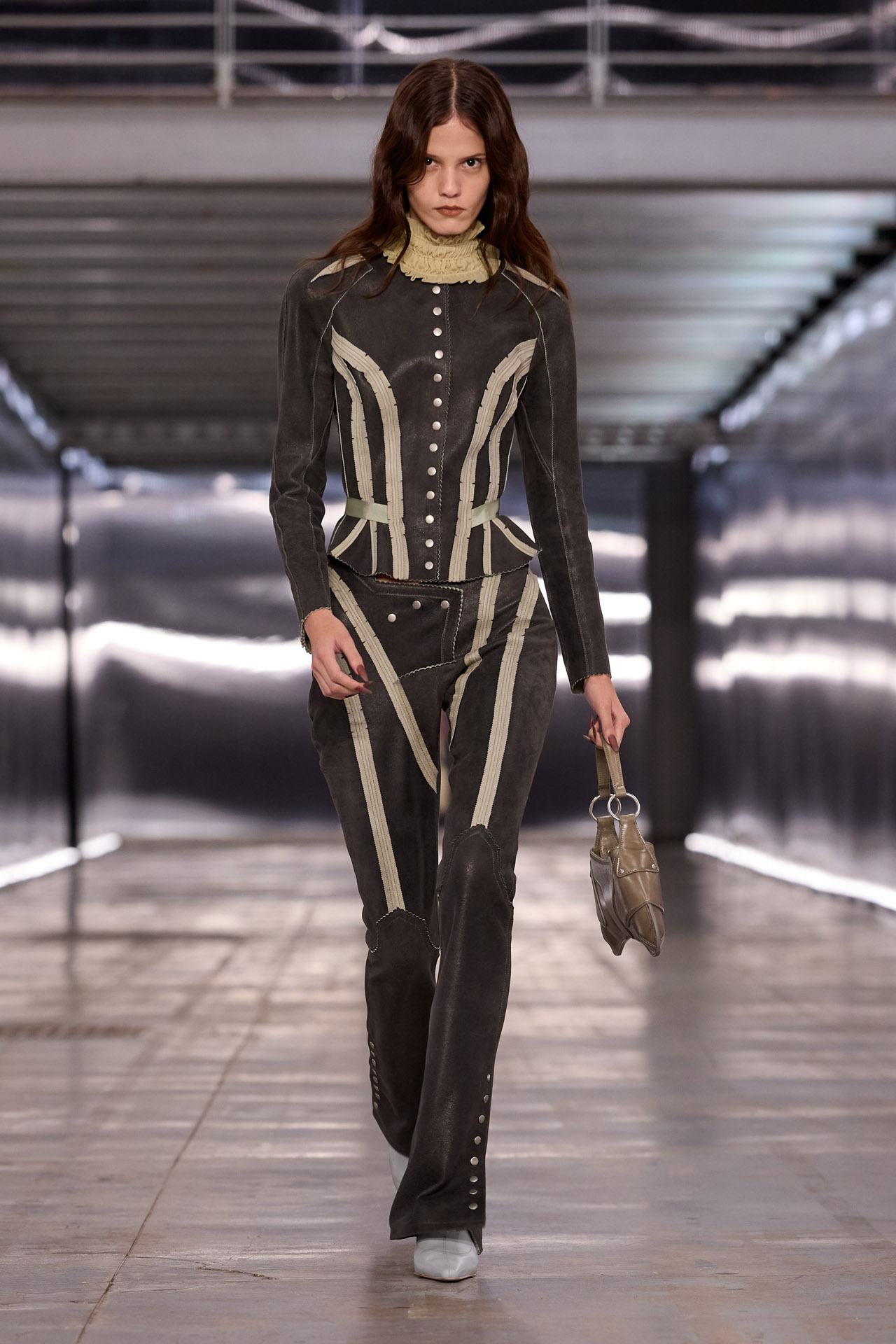 One standout look encapsulated this tension perfectly: a pair of sand-colored, skin-tight leggings buttoned at the hips, paired with a dark grey suede corset that dropped its straps to reveal a bra structured like a choker. The detailing was precise, the silhouette unapologetic. Corsetry appeared with new ferocity. Shoulders exposed, seams traced in contrasting lines, bodies contoured into aerodynamic form. Leather trousers were pleated and buttoned like biker gear underwear, while cropped blazers and mini skirts balanced severity with a feminine softness.